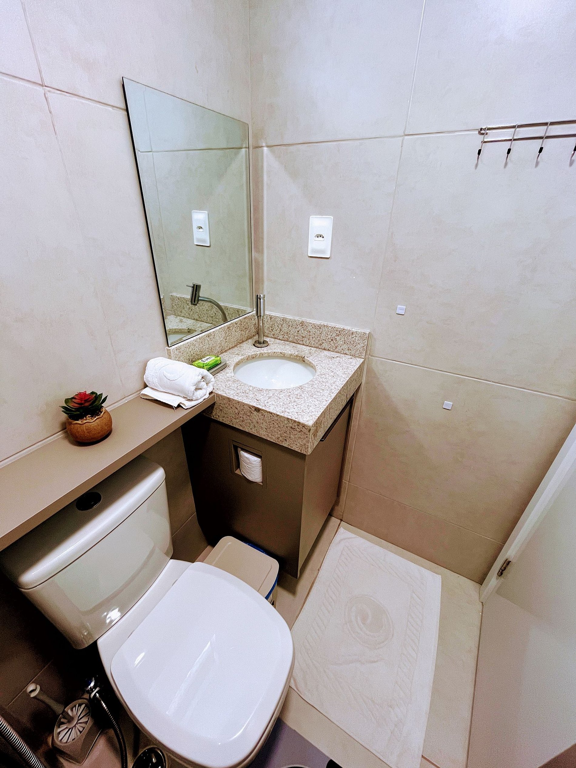 Com recepção 24 horas, os hóspedes contam com praticidade e segurança em qualquer momento do dia. O edifício dispõe ainda de academia equipada, brinquedoteca com um pequeno jardim — ideal para famílias com crianças — e estacionamento rotativo para maior comodidade.