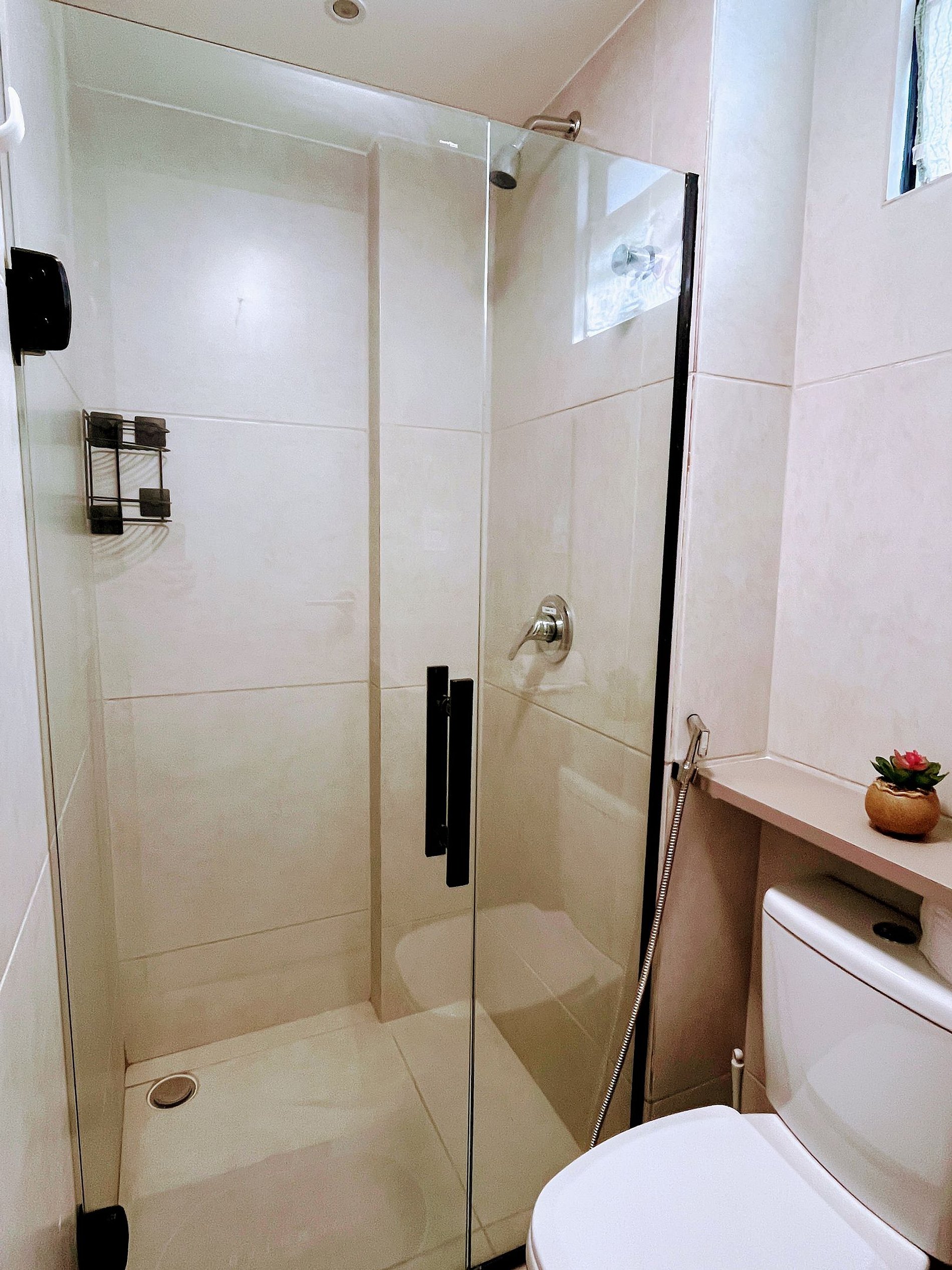 Banheiro: Chuveiro em inox com água quente ou fria, box de vidro, pia em granito e espelho largo.