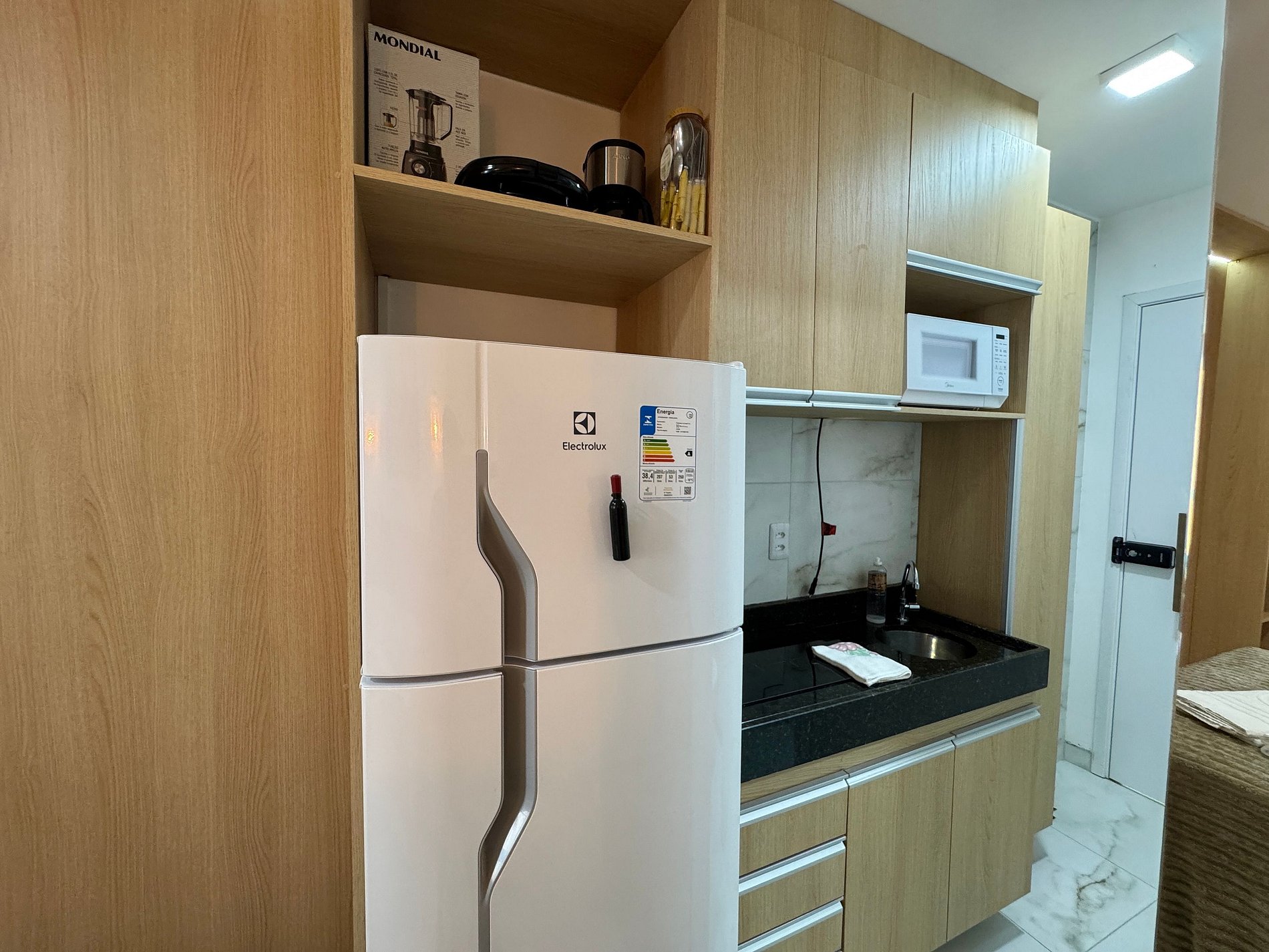Cozinha: Micro-ondas, geladeira, mesa com cadeiras, fogão e panelas de indução, liquidificador, torradeira, talheres e louças básicas.