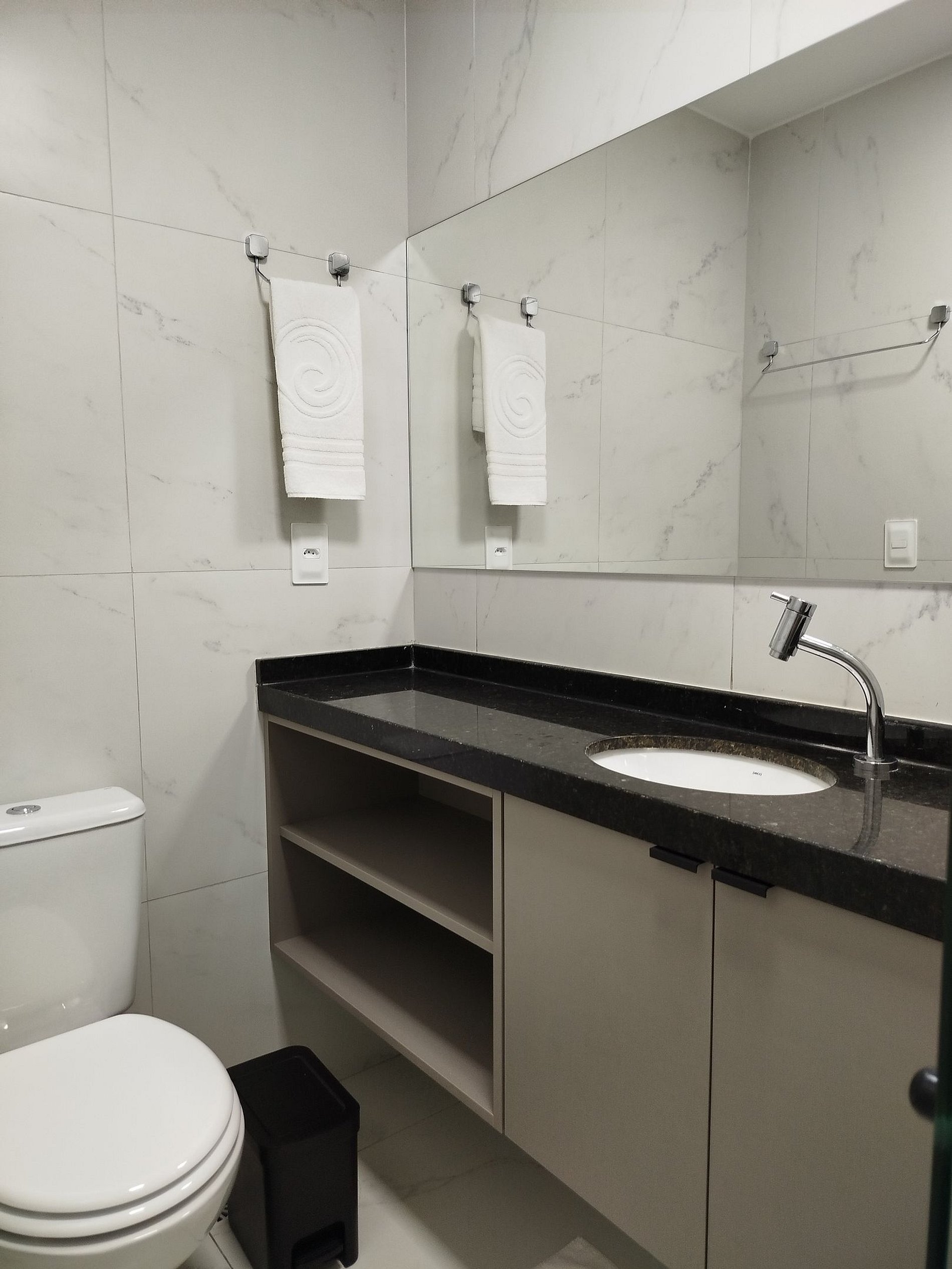 Banheiro: Chuveiro em inox com água quente ou fria, box de vidro, pia em granito e espelho largo.