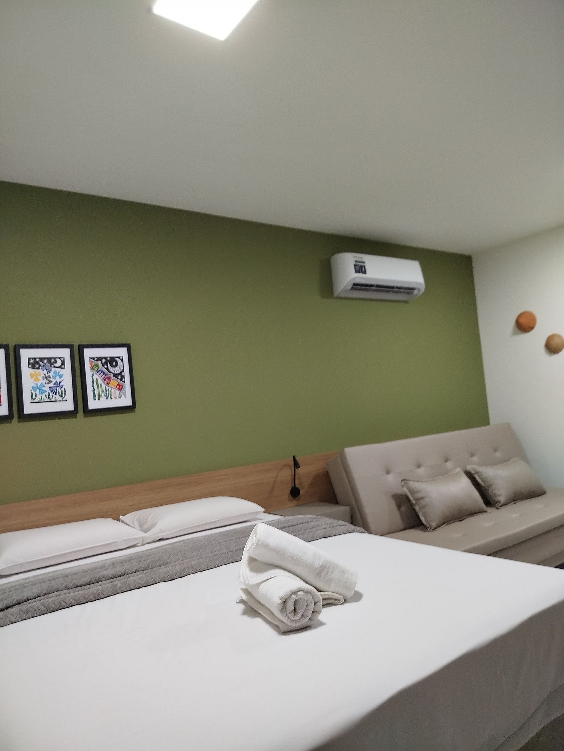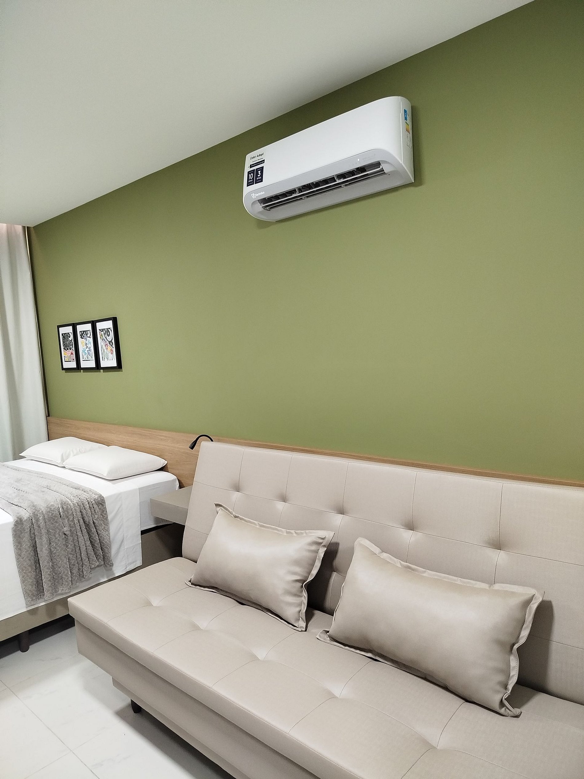 Quarto/sala: Sofá cama com 2 lugares para solteiros, cama queen, televisão smart-TV com conexão à internet, roupeiro com cabides