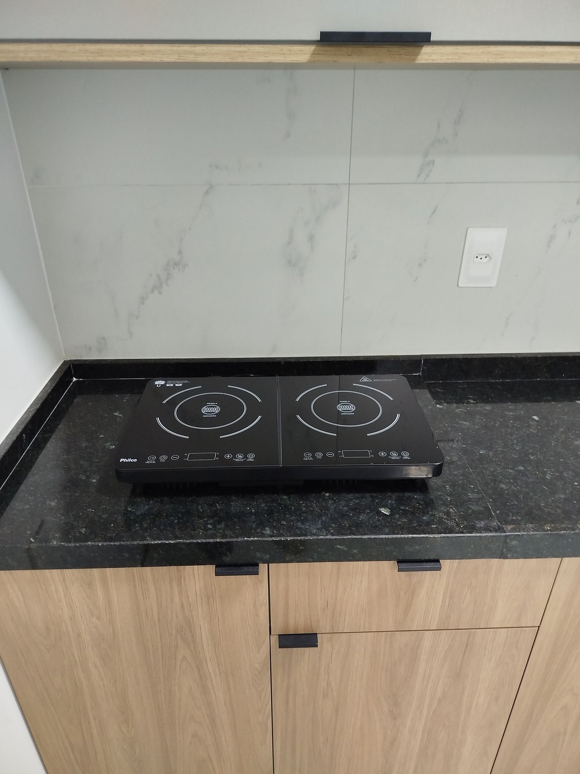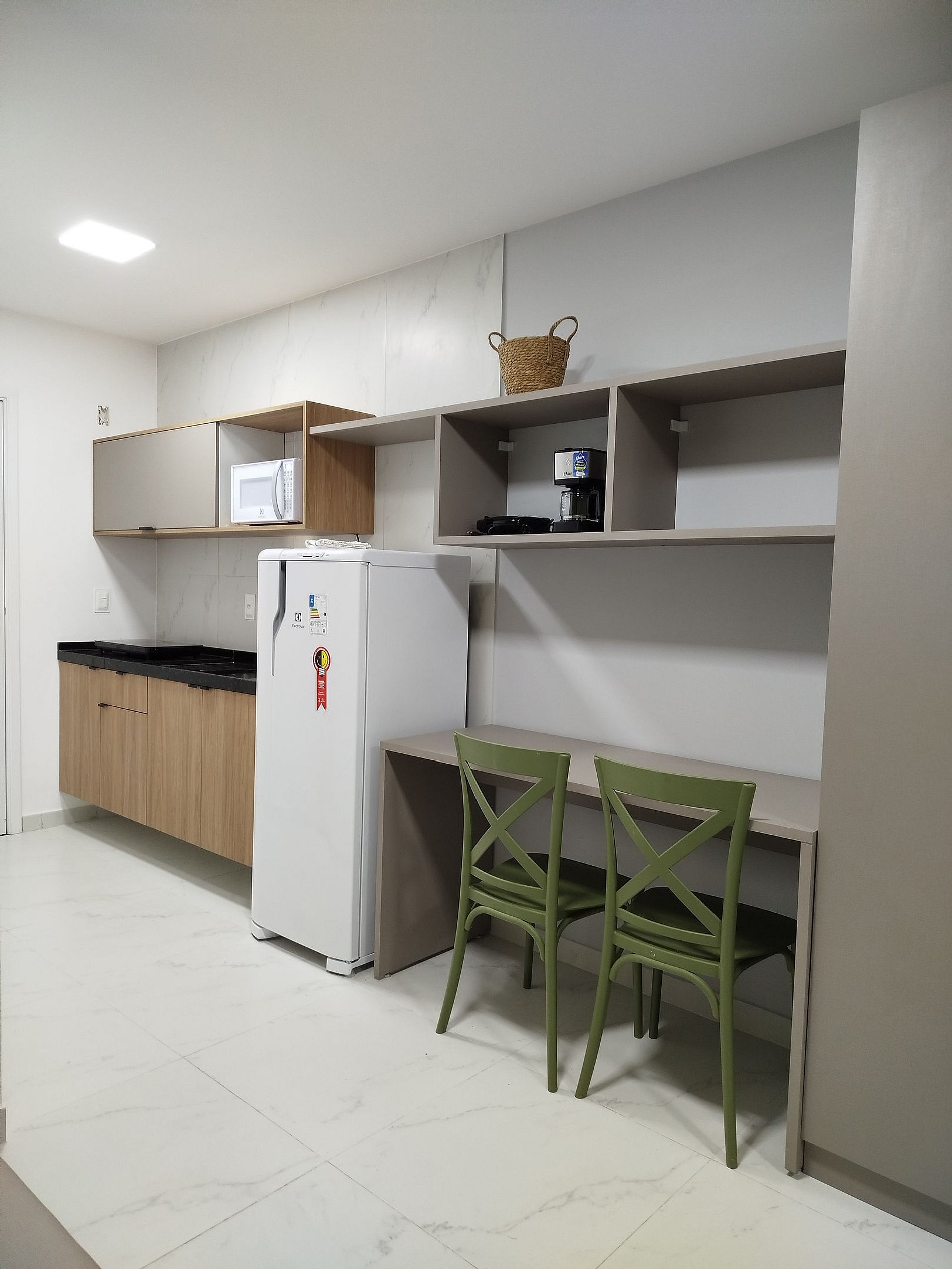 Cozinha: Micro-ondas, geladeira, mesa com cadeiras, fogão e panelas de indução, liquidificador, torradeira, talheres e louças básicas.