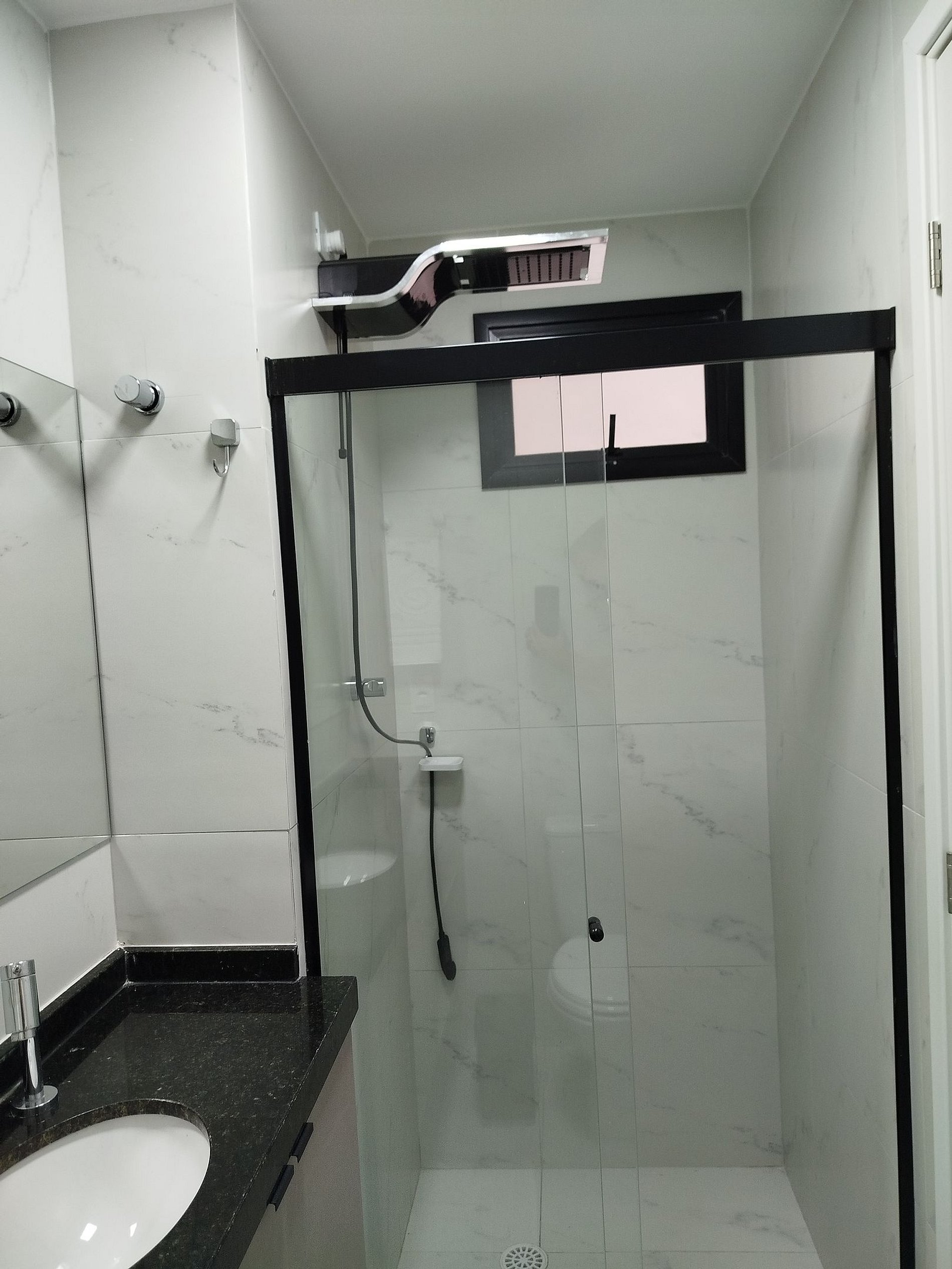 Banheiro: Chuveiro em inox com água quente ou fria, box de vidro, pia em granito e espelho largo.