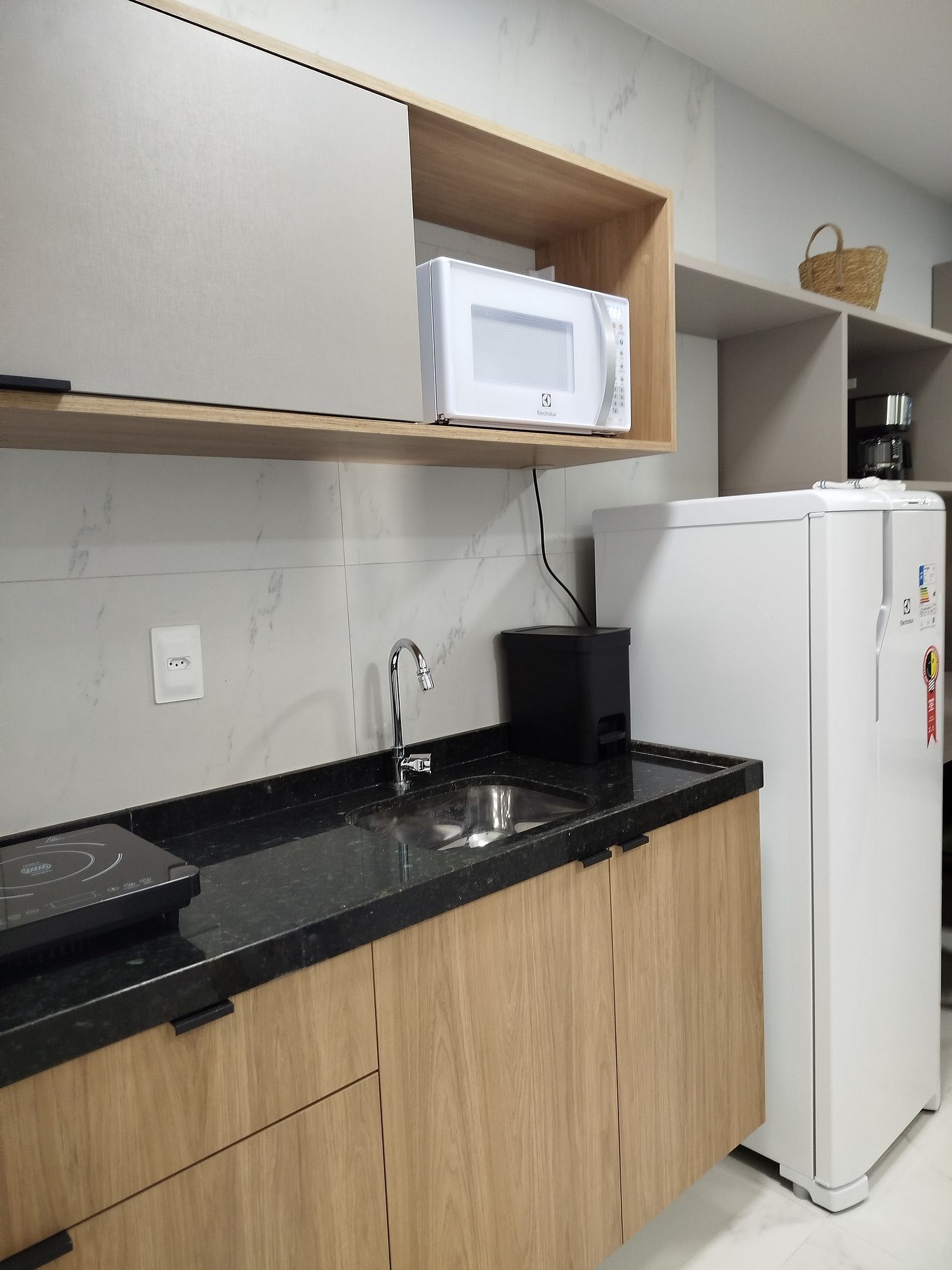 Cozinha: Micro-ondas, geladeira, mesa com cadeiras, fogão e panelas de indução, liquidificador, torradeira, talheres e louças básicas.