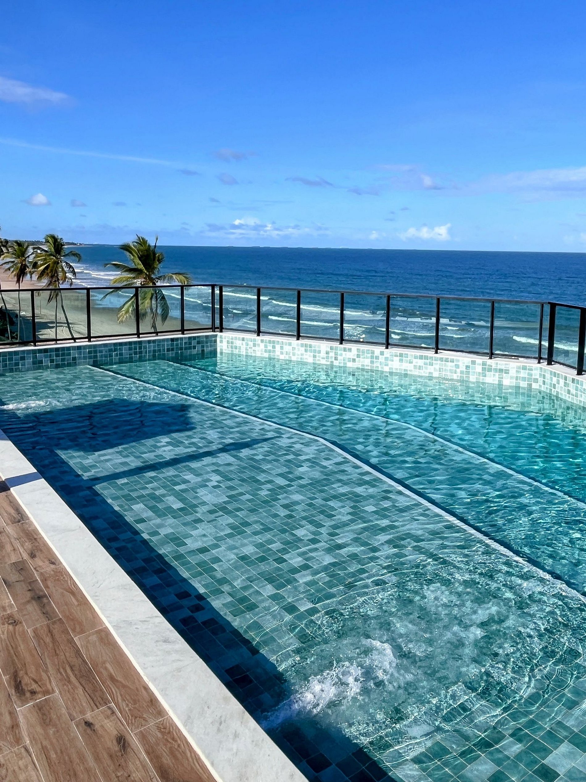 No rooftop, o cenário é ainda mais encantador: uma elegante piscina com vista panorâmica para o mar integra-se a um lounge cuidadosamente decorado, com mesas e cadeiras que proporcionam um ambiente perfeito para contemplar tanto o azul do oceano quanto a beleza única do manguezal ao entardecer. Para completar, o prédio oferece lavanderia equipada com máquinas lava e seca, agregando conveniência e autonomia à estadia.